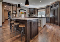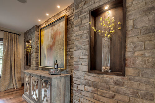 The intricate rockwork, traditional style cabinets made out of reclaimed wood, and industrial appliances creates a perfect marriage of styles in this kitchen